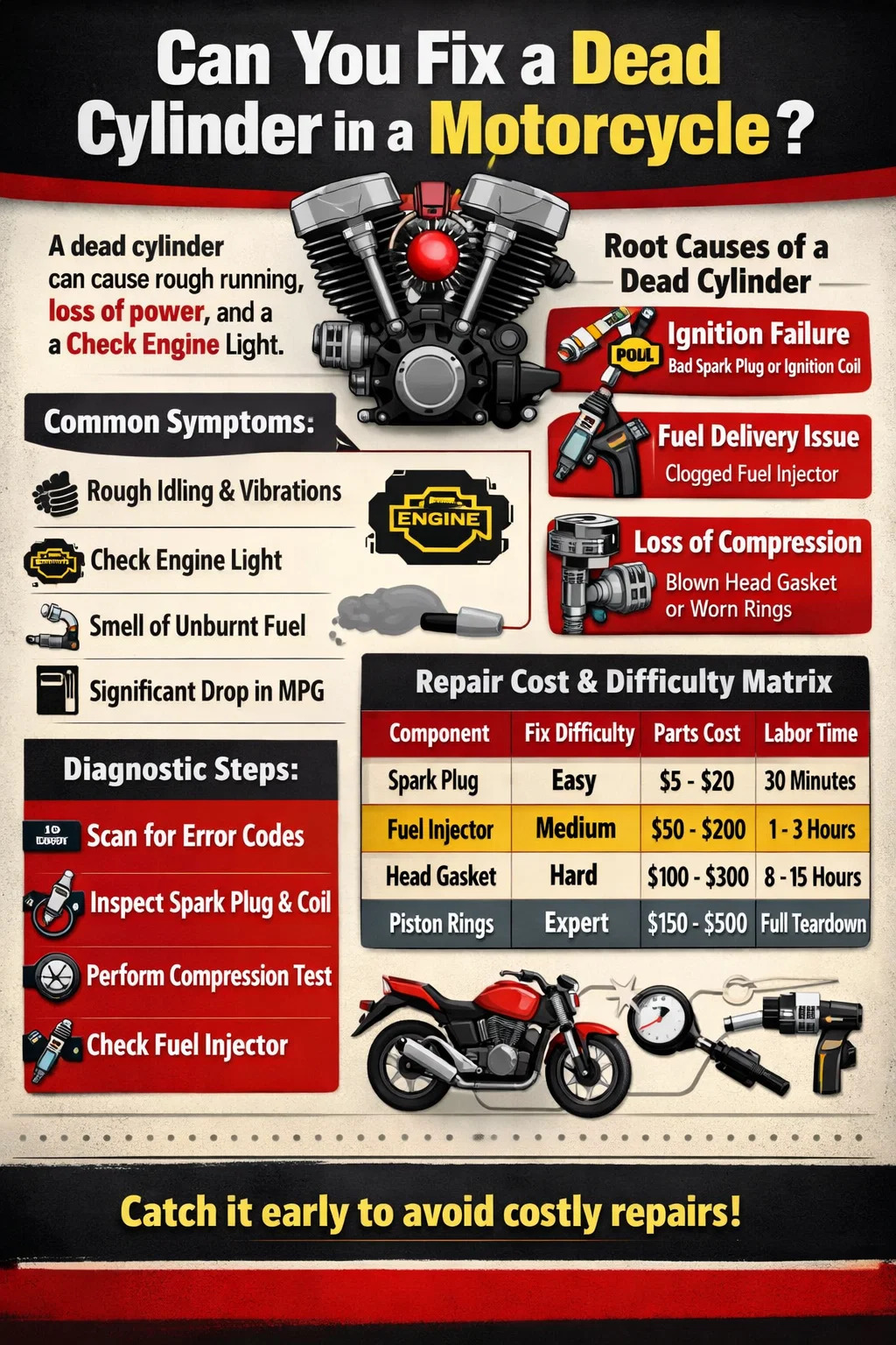 Ní gá gur pianbhreith báis é "sorcóir marbh" do d'inneall, ach braitheann castacht an tsocraithe go hiomlán ar cad ba chúis leis an teip. Sea, is féidir sorcóir marbh a shocrú beagnach i gcónaí , ag réimsiú ó bhabhtáil spréachphlocóid shimplí 10-nóiméad go stróiceadh iomlán innill a bhaineann le meaisíniú an bhloc innill. Braitheann an cosán a ghnóthú ar cibé an bhfuil an cheist "seachtrach" (breosla nó Spark) nó "inmheánach" (teip meicniúil agus caillteanas comhbhrú).