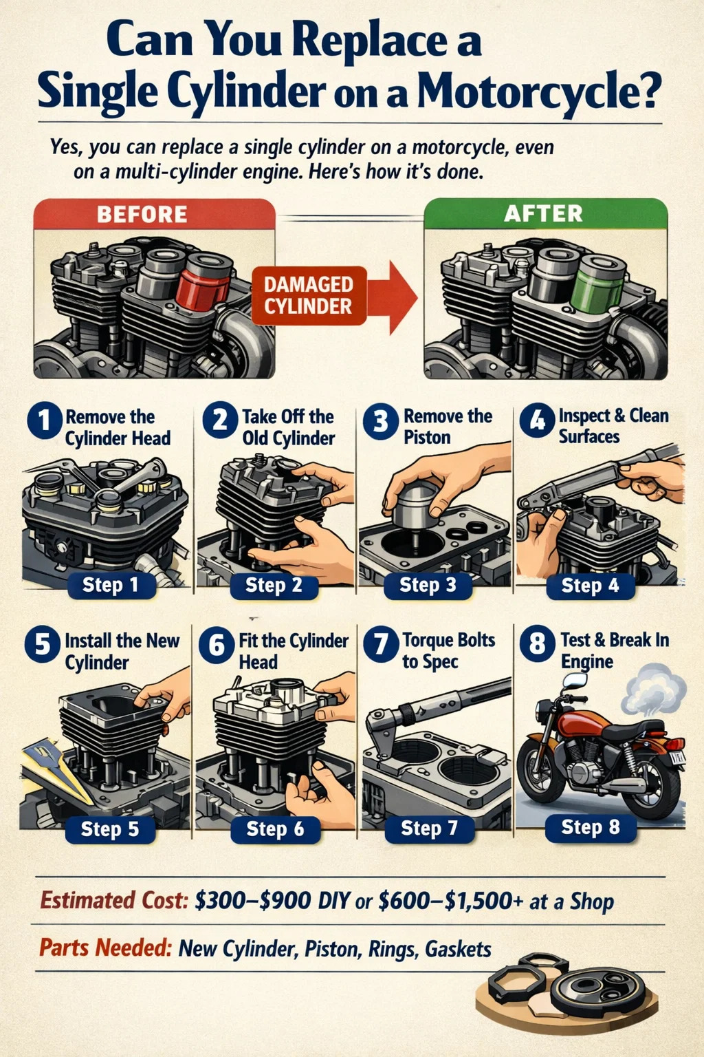 Is ea an freagra gairid - is féidir leat sorcóir aonair gluaisrothair a athsholáthar, agus do rothair aon-sorcóra go háirithe, tá sé seo ar cheann de na jabanna innill is simplí a fhéadfaidh meicneoir baile nó siopa le taithí a dhéanamh. Cibé an bhfuil tú ag déileáil le tolladh scórála, le bairille scoilte, nó le caitheamh mór nach féidir le honáil a shocrú a thuilleadh, is cosán deisiúcháin seanbhunaithe é an sorcóir a mhalartú. Ar ghluaisrothair il-sorcóir, tá feidhm ag an bprionsabal céanna: is féidir sorcóirí aonair a athsholáthar gan an t-inneall iomlán a tharraingt nó a atógáil, cé go n-ardaíonn an chastacht le líon na sorcóirí atá i gceist.