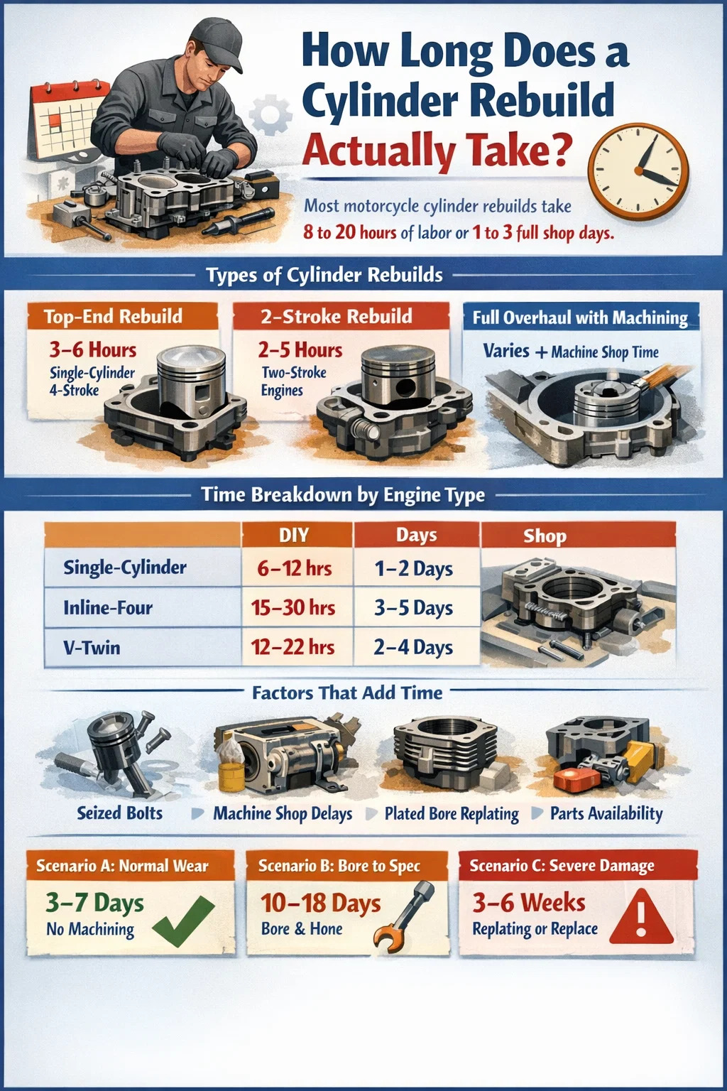 Is minic gurb é infhaighteacht páirteanna an mhoill aonair is mó in atógáil sorcóir gluaisrothar. Tá loiní OEM le haghaidh samhlacha táirgeachta reatha ar fáil de ghnáth laistigh de 3 go 7 lá gnó ó dhéileálaí. Is minic a bhíonn roghanna iarmhargadh ó bhrandaí mar Wiseco, JE Pistons, nó Vertex i stoc agus is féidir iad a sheoladh ar an lá céanna. I gcás samhlacha níos sine nó scoite, is féidir páirteanna a ghlacadh 2 go 6 seachtaine chun foinse, go háirithe ó sholáthróirí thar lear. Má dhéantar páirteanna a ordú roimh bhriseadh síos — nuair a bheidh a bhfuil de dhíth ar an rothar deimhnithe agat — laghdaítear an t-am féilire go suntasach.