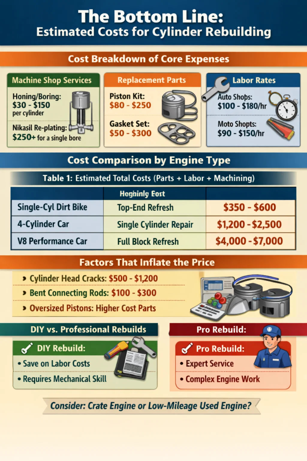 Go ginearálta is ionann an costas a bhaineann le sorcóir a atógáil $500 go $1,500 in aghaidh an tsorcóra le haghaidh innill ngluaisteán, agus amháin sorcóir gluaisrothar is féidir a athnuachan go minic le haghaidh idir $300 agus $800 . Athraíonn na figiúirí seo go fiáin bunaithe ar cibé an bhfuil tú ag déanamh athnuachana “barr-deireadh” (fáinní agus gaiscéid) nó athchóiriú iomlán meicniúil a bhaineann le loiní leadránach, líofa agus rómhóra. Má dhéanann tú an teardown tú féin, is féidir leat a shábháil go mór ar shaothar, a dhéanann cuntas de ghnáth 60% go 70% den sonrasc iomlán.