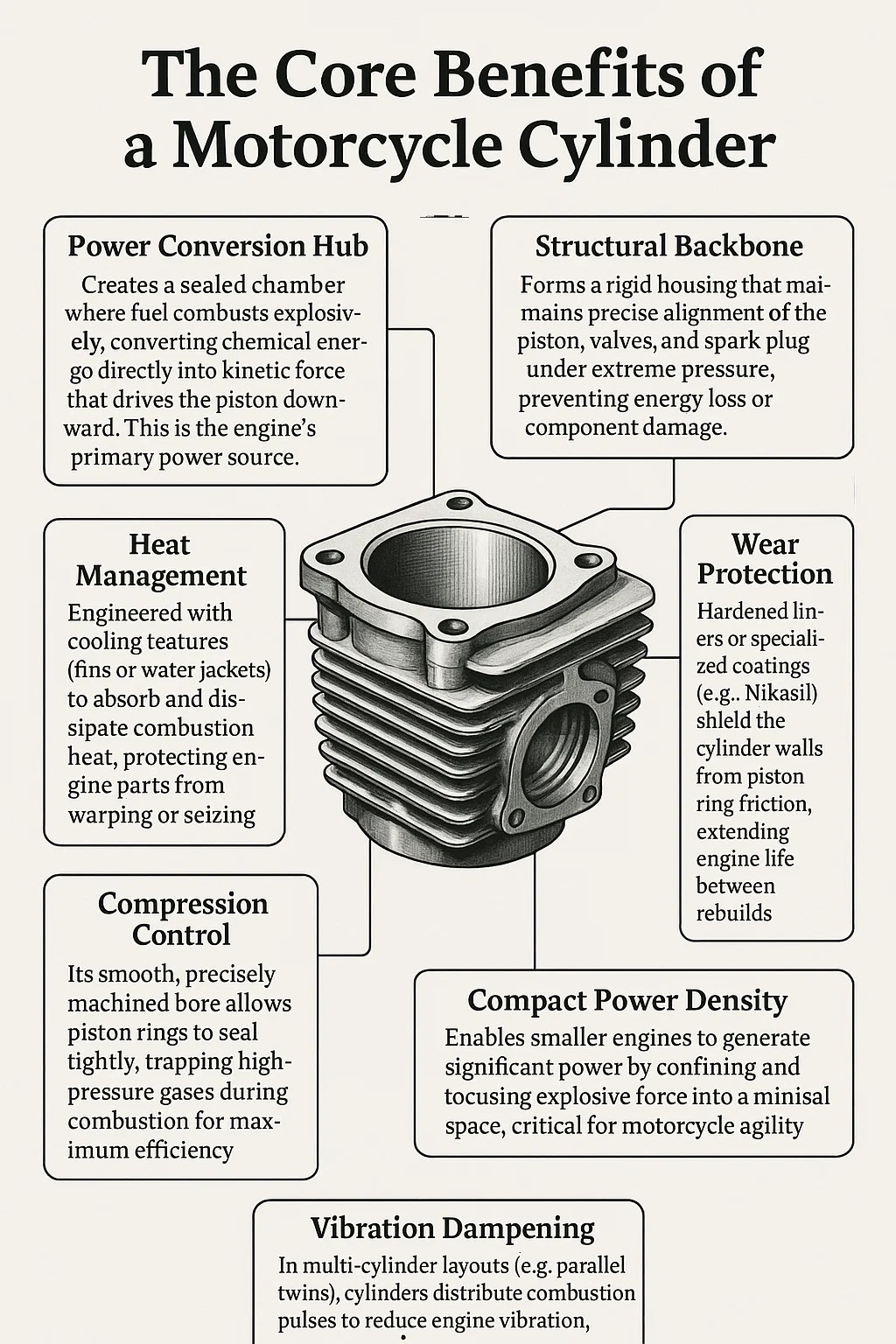 | Diomailt Teasa | Tarraingíonn eití (aerfhuaraithe) nó pasáistí chuisnithe (leacht-fhuaraithe) teas ón dó go tapa. | Cosnaíonn inneall ó róthéamh, fiú le linn marcaíocht chrua. |