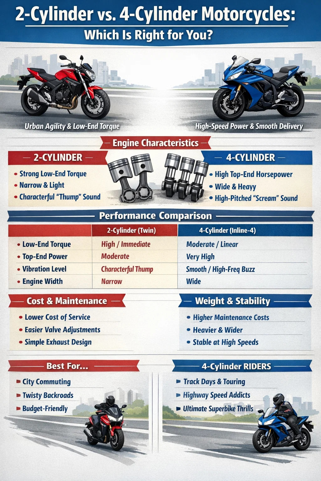 Níl aon fhreagra uilíoch ar an gceist an bhfuil gluaisrothar 2-sorcóir nó 4-sorcóir "níos fearr", ach tá an t-idirdhealú feidhmiúil soiléir: Tá gluaisrothar 2-sorcóir níos fearr le haghaidh chasmhóiminte íseal-deireadh, aclaíocht uirbeach, agus eirgeanamaíocht chúng, agus is é gluaisrothar 4-sorcóir an rí gan amhras maidir le cobhsaíocht ardluais, cumhacht capall barr, agus seachadadh cumhachta réidh. Más comaitéireacht cathrach agus cineálacha sléibhe daingean atá i do mharcaíocht, is minic a sholáthraíonn dhá shorcóir eispéireas níos mealltaí. Mar sin féin, má tá tú ag iarraidh scread inneall ard-revving agus do chuid ama a chaitheamh ar rianta nó ar mhórbhealaí fada, is fiú ceithre sorcóir an meáchan agus an costas breise.